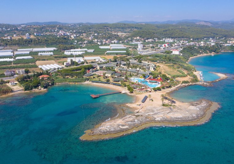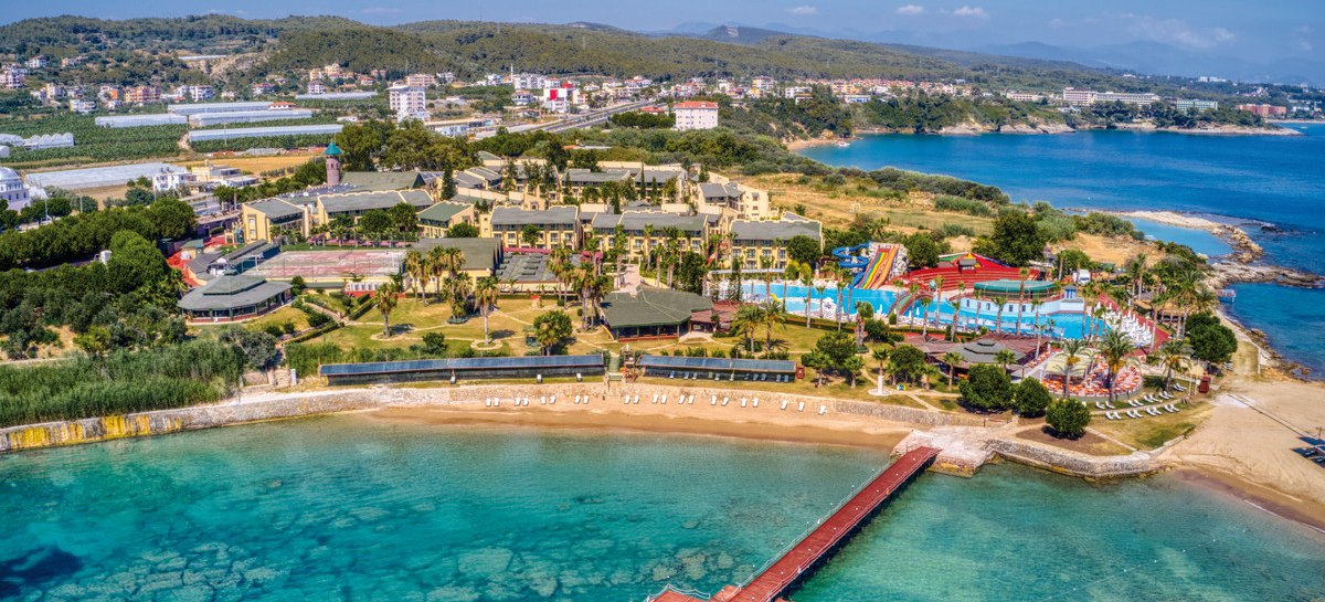 Ihr residiert direkt am hoteleigenen grobsandigen Strand, mit freiem Blick auf das Meer und kurzen Wegen zwischen Zimmer, Pool und Wasserlinie. Bis Alanya sind es etwa 28 Kilometer; das nächste Ortszentrum erreicht Ihr nach rund 3 Kilometern. Öffentlicher Verkehr hält unmittelbar am Hotel.