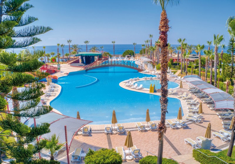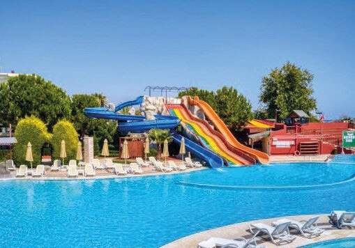 Im Außenbereich dominiert ein Süßwasserpool mit drei Wasserrutschen, breite Liegeflächen sowie Tücher, Schirme und Auflagen an Pool und Strand. Hallenbad, Garten und Sonnenterrassen runden das Bild ab. Öffentliche Verkehrsanbindung direkt am Hotel erleichtert Ausflüge. Highlight: Großer Poolbereich mit Wasserrutschen nahe dem Strand.