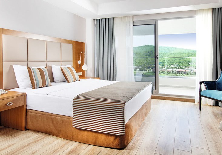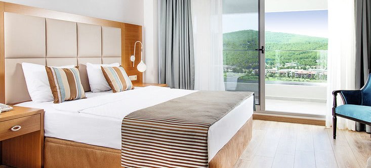 Die 450 Zimmer verteilen sich auf Haupt- und Nebengebäude und sind mit Dusche, Klimaanlage, Minibar, Safe, LCD-Sat-TV, WLAN sowie Telefon und Föhn ausgestattet. Viele Einheiten bieten Balkon oder Terrasse, teils mit Meer-, Garten-, Pool- oder Strandblick für klare Ausblicke.
