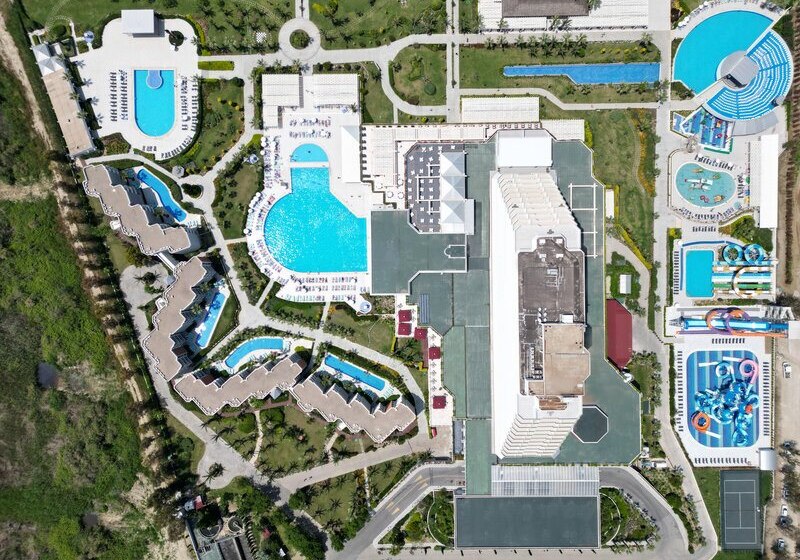 Die Anlage bietet breite Gemeinschaftsbereiche mit MAIN POOL (ca. 1.200 m²), separaten Kinderbecken und Wasserpark (10–17 Uhr). WLAN ist in Lobby und Zimmern verfügbar. Aufzüge, Sonnenterrassen, Shops, Supermarkt und vielfältige Bars sorgen für kurze Wege und verlässliche Abläufe.