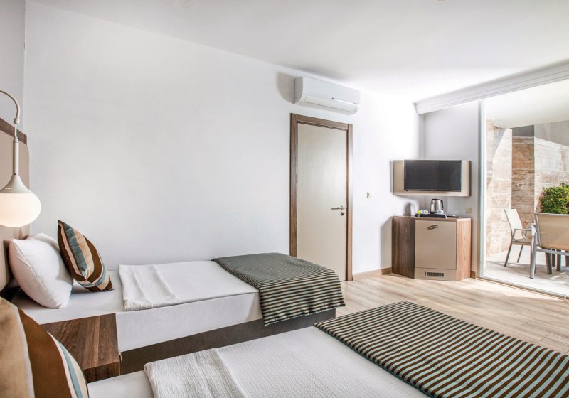 Familienzimmer, Optionen mit Etagenbett sowie Doppel-, Twin- und Einzelbetten schaffen passende Setups. Ausgewiesene Ausstattungsdetails reichen bis zu Zimmern mit privatem Pool. Holz- bzw. Parkettböden, Kaffee-/Teezubereiter und durchdachte Steckdosenplatzierungen runden den funktionalen Komfort ab.