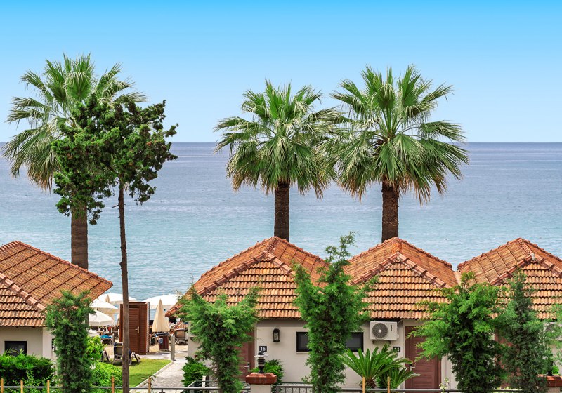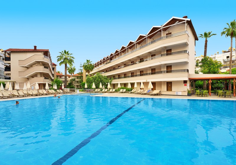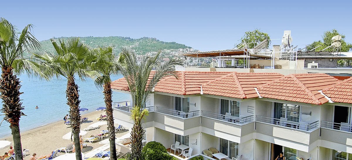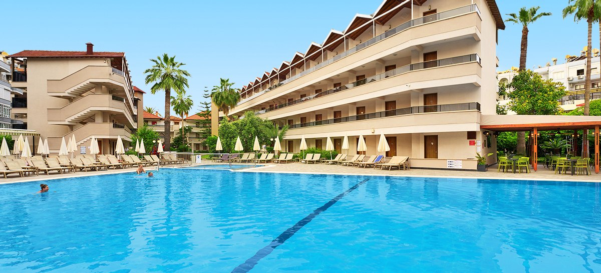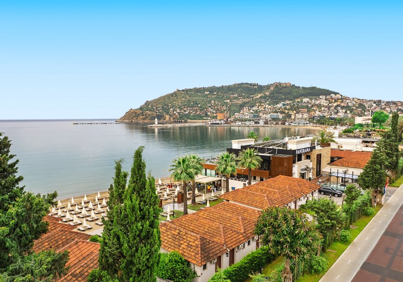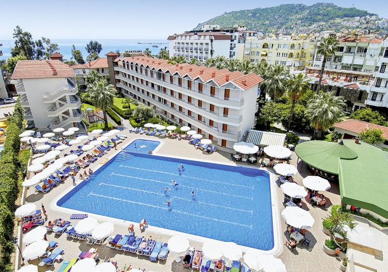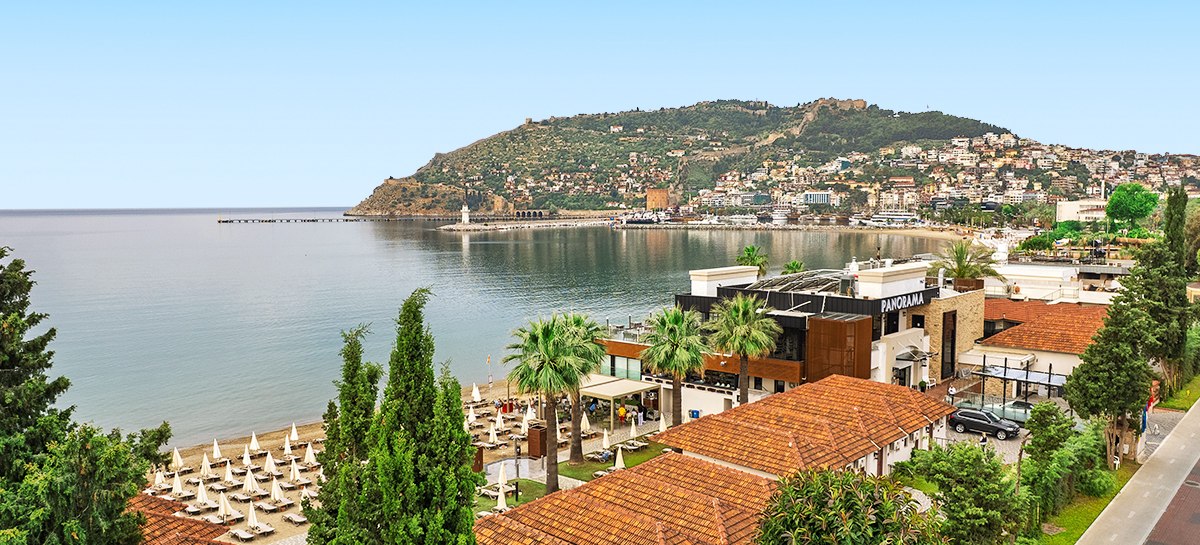 Im Panorama Hotel wohnt Ihr direkt am Sand-/Kiesstrand von Alanya – zentral, strandnah und mit eigener Beachbar. Die Wege sind kurz: über eine Unterführung erreicht Ihr die Strandseite, im Haus erwarten Euch eine lebendige Empfangshalle, Gartenbereiche und ein Süßwasser-Pool mit separatem Kinderbecken. Das Ambiente wirkt unkompliziert, gut organisiert und auf erholsame Strandtage ausgerichtet.