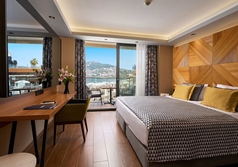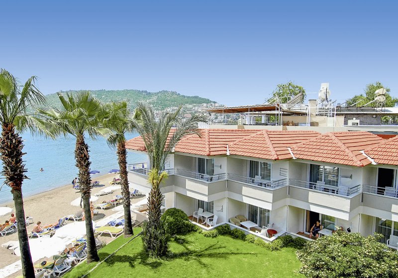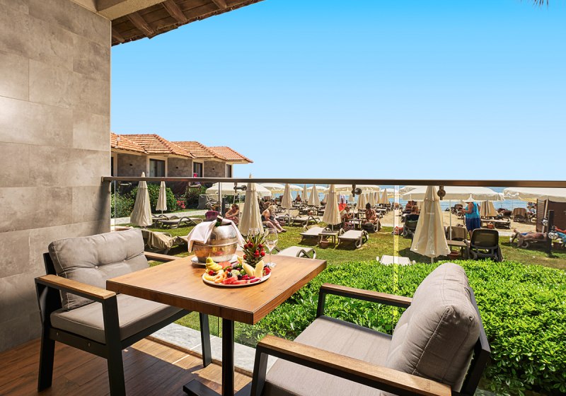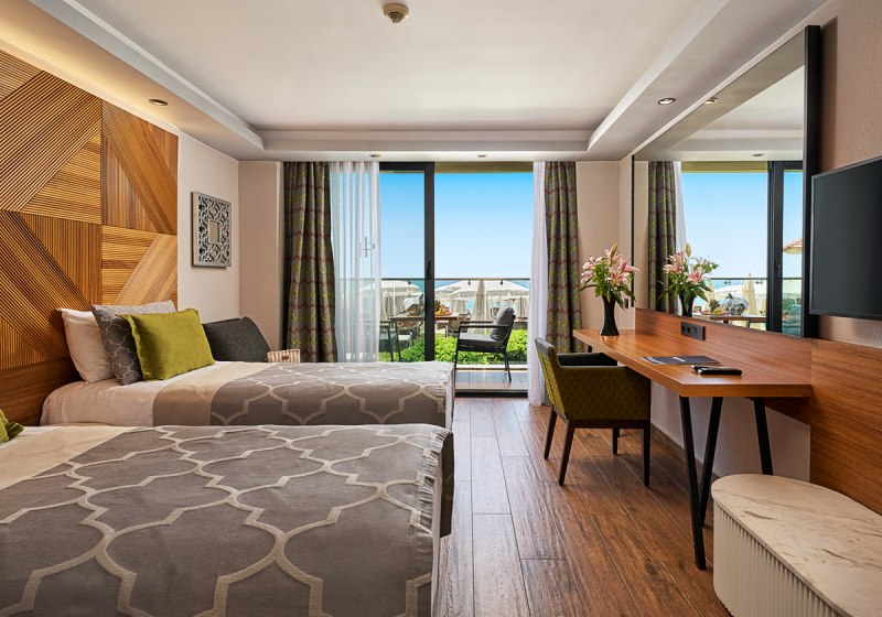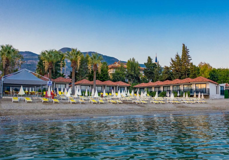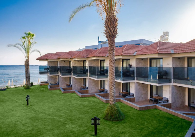 Familien schätzen die Familienzimmer mit zwei Schlafräumen und Verbindungstür; Aktivreisende nutzt Ihr Tennis-Hartplatz, Fitnessraum und Beachvolleyball. Wer es ruhig mag, findet auf Sonnenterrassen und Liegewiese Platz. Kulinarisch habt Ihr Buffet, À-la-carte und mehrere Bars – darunter eine Panoramabar mit weitem Blick. Der Wellnessbereich mit Hamam, Sauna und Anwendungen ergänzt den Tag am Meer. Highlight: Direkte Strandlage mit eigener Beachbar und Unterführung zur Strandseite.