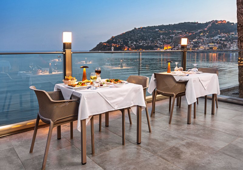 Ihr wohnt im Zentrum von Alanya, direkt am Sand-/Kiesstrand. Eine Unterführung verbindet Hotel- und Strandseite, die hoteleigene Beachbar liegt nur Schritte entfernt. Einkaufsmöglichkeiten und Restaurants erreicht Ihr nach etwa 30 Metern, das Stadt- und Touristenzentrum nach rund 500 Metern. Bars und Clubs liegen in einer Entfernung von etwa 700 Metern – nah genug für Abende, weit genug für ruhigere Nächte.