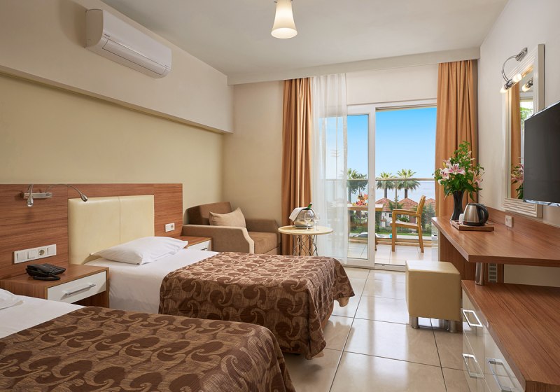 Ihr wohnt in Zimmern mit individueller Klimaanlage, Dusche/WC, Föhn, Smart-Sat.-TV mit Musikkanal, Direktwahl-Telefon, Safe (Miete), Kaffee-/Teezubereiter und Mini-Kühlschrank. Der Fliesenboden hält alles angenehm pflegeleicht, WLAN verbindet Euch verlässlich. Ein Balkon erweitert den Raum nach draußen – je nach Kategorie mit Garten- oder Meerblick.