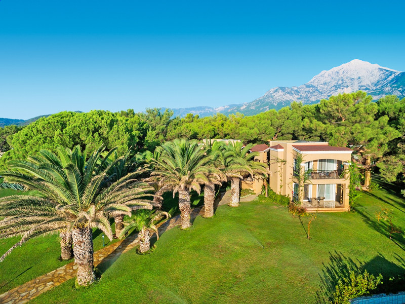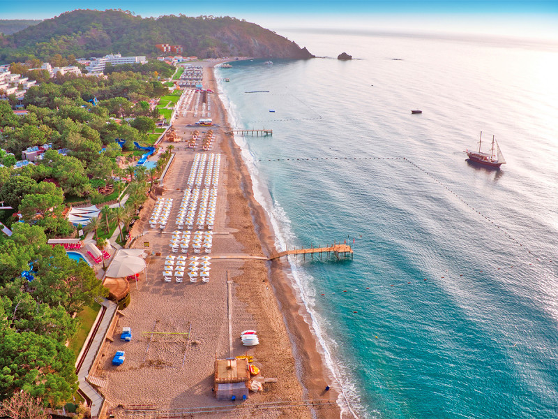 Tekirova, Mittelmeerküste, Meerblick und Wald in der Umgebung: Hier wohnt Ihr direkt am hoteleigenen, 250 Meter langen Privatstrand. Bis Kemer sind es etwa 18 Kilometer, der Flughafen Antalya liegt rund 70 Kilometer entfernt. Die Lage bietet Euch kurze Wege zwischen Strand, Strandbar und Resortbereichen, dazu klare Orientierungspunkte in der Region.