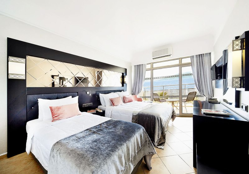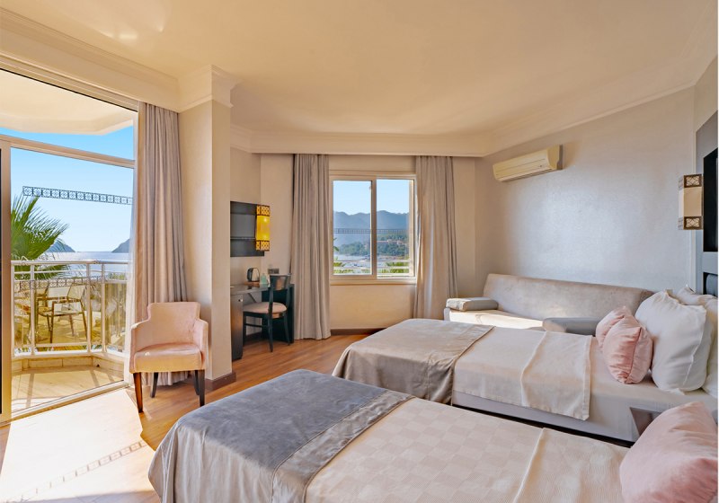Im Prime Beach Hotel wohnt Ihr direkt am Sand‑/Kiesstrand und startet in einen Strandtag ohne Umwege. Die Anlage wirkt grosszügig, mit Gartenbereichen, Sonnenterrassen und zwei Aussenpools samt Kinderbecken und drei Wasserrutschen. WLAN begleitet Euch im gesamten Hotel, die Rezeption ist durchgehend besetzt. Highlight: Direkte Strandlage mit kurzer Distanz nach Marmaris.