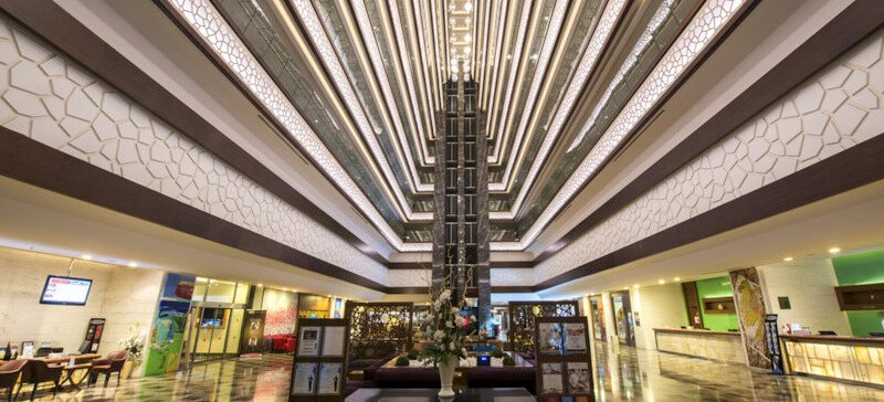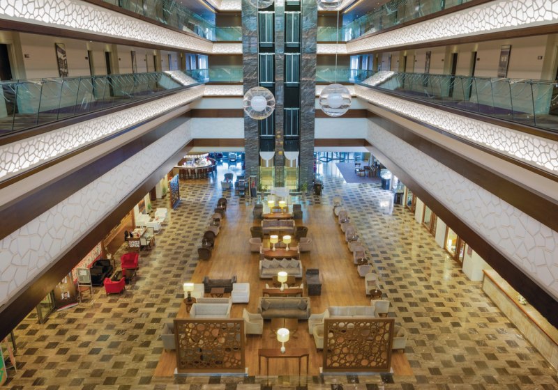 Die öffentlichen Bereiche sind klar organisiert: Lobby mit 24-Stunden-Rezeption, WLAN im gesamten Hotel, Lobbybar, Bibliothek und Geschäfte. Eine Sonnenterrasse führt zur Badeplattform; dazu kommt ein Süßwasser-Außenpool. Acht Lifte verbinden die Etagen, 2010 erbaut, 17 Stockwerke, 315 Zimmer.