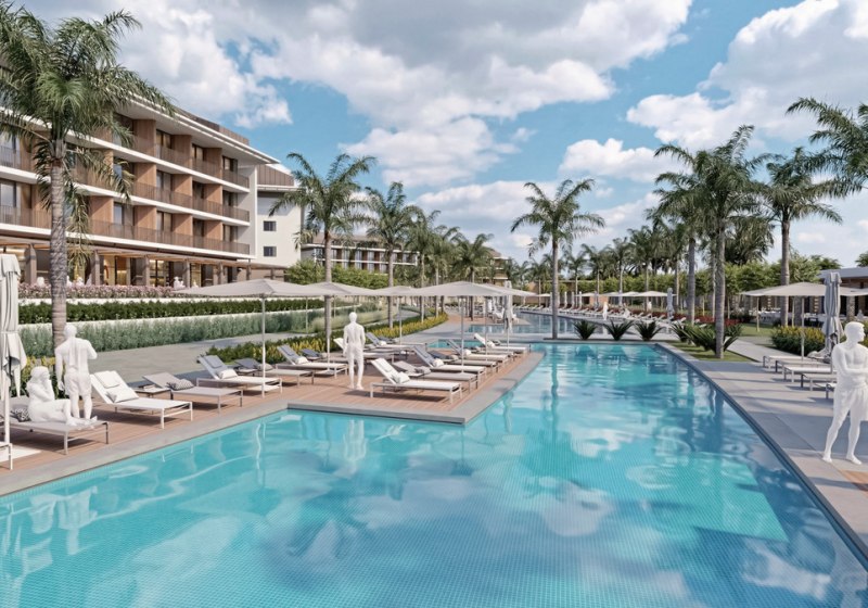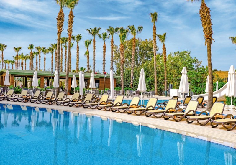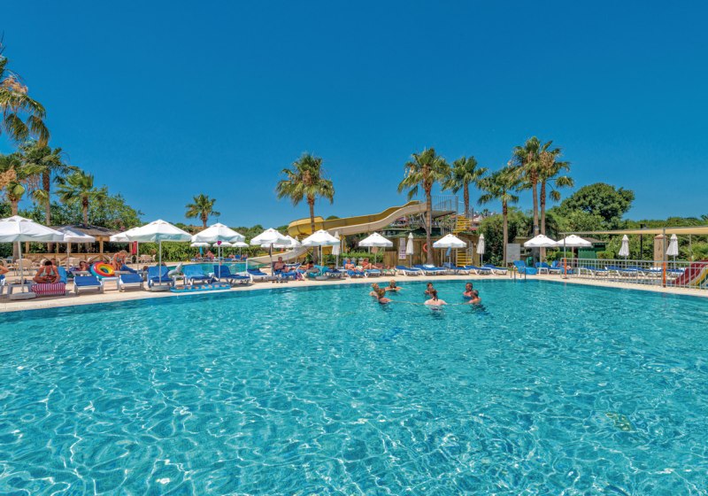 Die Anlage ist kompakt strukturiert: Lobby mit Rezeption und Lobbybar, Garten- und Terrassenbereiche, Shops bis zum Minimarkt. Mittelpunkt ist der Süßwasserpool mit zwei Wasserrutschen und Kinderbecken; Liegen und Schirme stehen an Pool und Strand bereit, Badetücher ergänzen den Komfort.