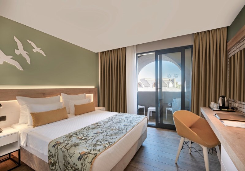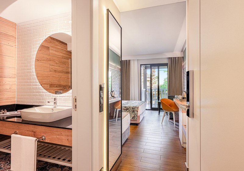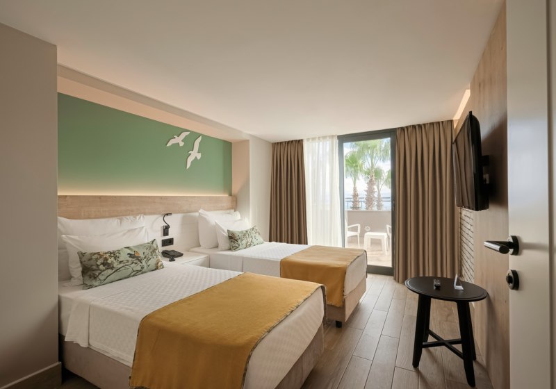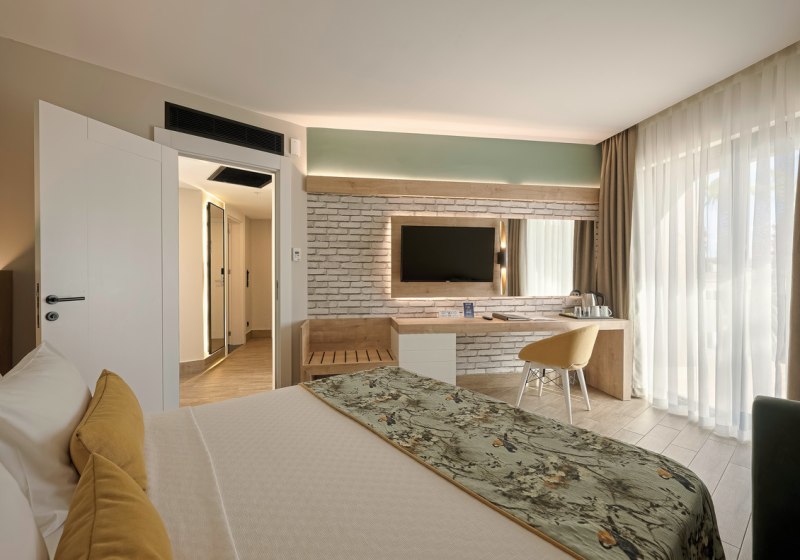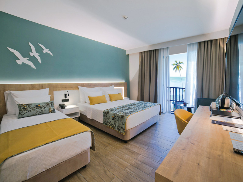 Die Zimmer sind funktional ausgestattet: individuell regulierbare Klimaanlage, LED-Sat-TV, Safe, Minibar sowie Tee- und Kaffee-Setup. Dusche, Kosmetikspiegel, Slipper und Föhn runden den Komfort ab. Der Boden ist gefliest, Balkon oder Terrasse öffnen den Blick nach draußen; in vielen Kategorien bucht Ihr Meer- oder Strandblick als klare Ausrichtung zum Wasser.