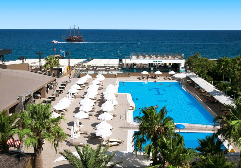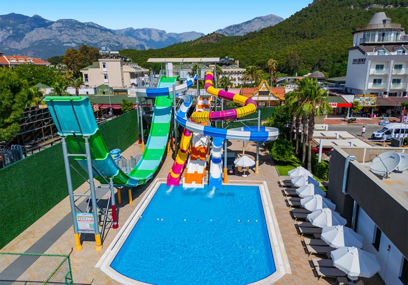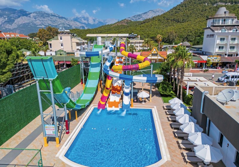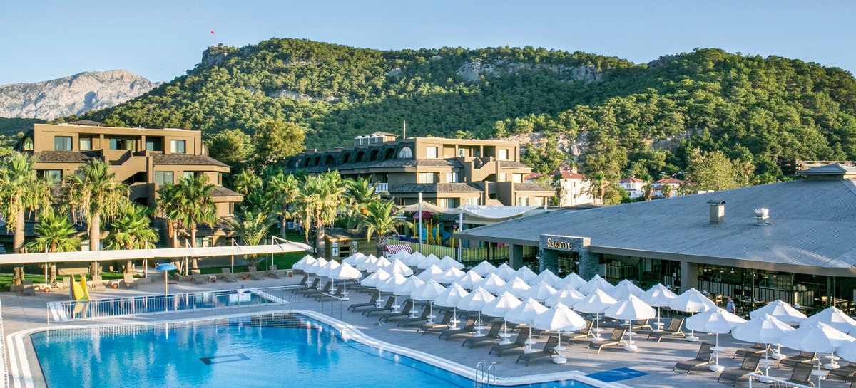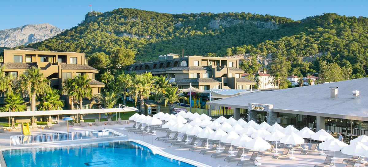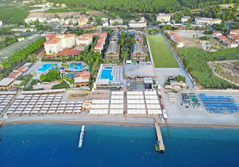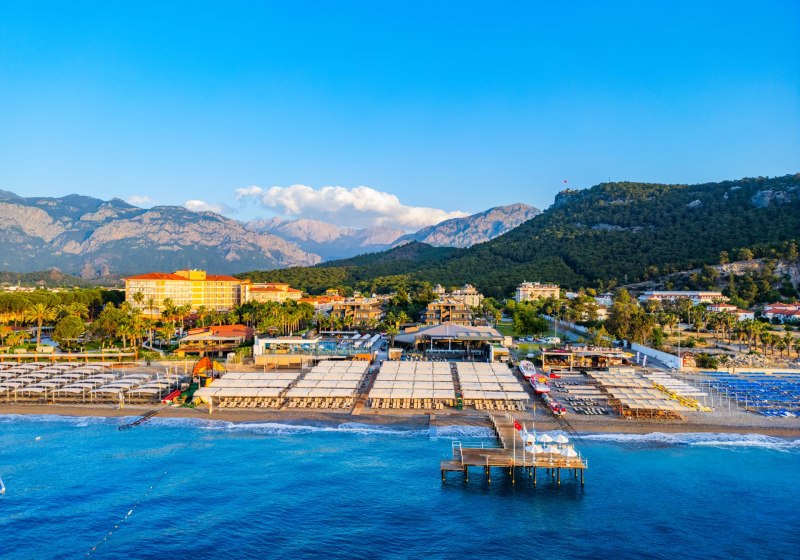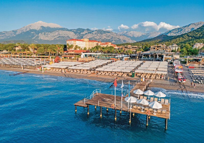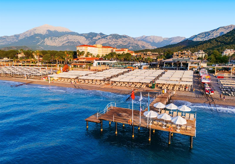 Ihr wohnt in erster Reihe am Kiesstrand von Kiris, rund 7 Kilometer von Kemer entfernt und etwa 50 Kilometer von Antalya. Die Verbindung ist unkompliziert: per Dolmus oder Taxi erreicht Ihr die Hafenpromenade von Kemer sowie die städtischen Angebote. Der hoteleigene Steg verkürzt den Weg ins Wasser, die Strandbereiche sind klar organisiert und mit Schirmen und Liegen ausgestattet.