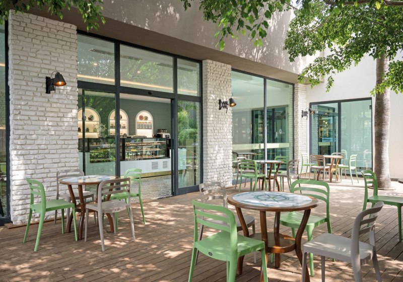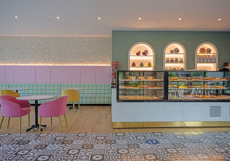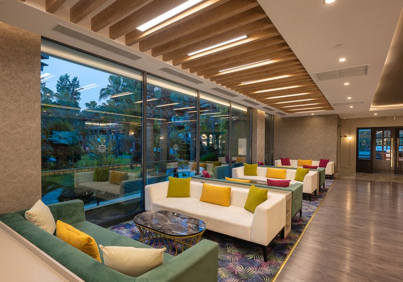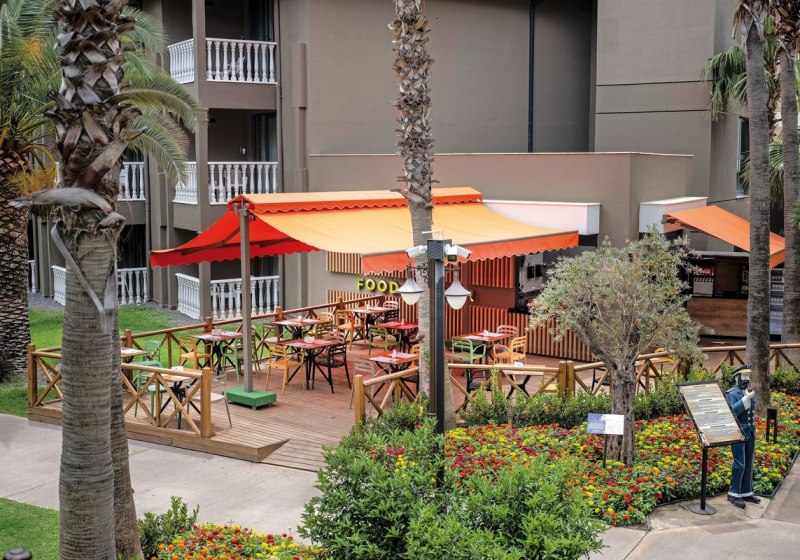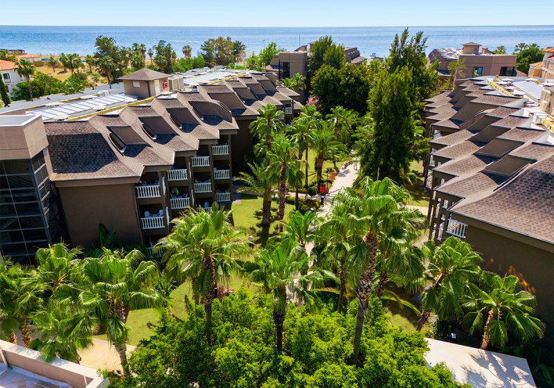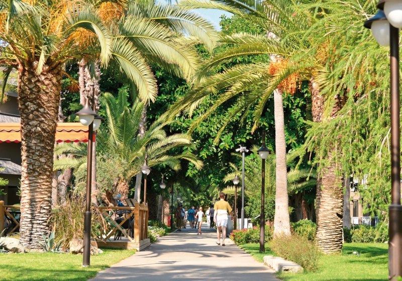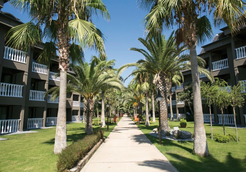 Die Anlage umfasst 324 Zimmer in vier vierstöckigen Gebäuden und wirkt durchdacht gegliedert: Empfangsbereich und Lobby sind Dreh- und Angelpunkt, von hier verzweigen sich Wege zu Konferenzraum, Shops und Friseur. High-Speed-WLAN ist in Zimmern und öffentlichen Bereichen inklusive. Im Außenbereich liegen ein Süßwasserpool, ein separates Kinderbecken sowie ein weiterer Pool mit vier Wasserrutschen.