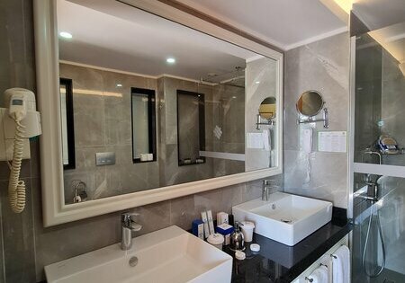 Familien wählen 33 m² grosse Zimmer mit separatem Schlafraum. Für individuelle Vorlieben stehen Doppel- oder Kingsize-Betten, Zustell- und Kinderbetten bereit. Ein Vergrößerungsspiegel und Kosmetikartikel ergänzen den Komfort. Highlight: Familienzimmer mit separatem Schlafraum und klarer Raumaufteilung.