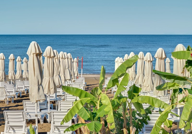 - Eigener Strand: Hoteleigener Abschnitt mit Liegen, Schirmen und Badetüchern.