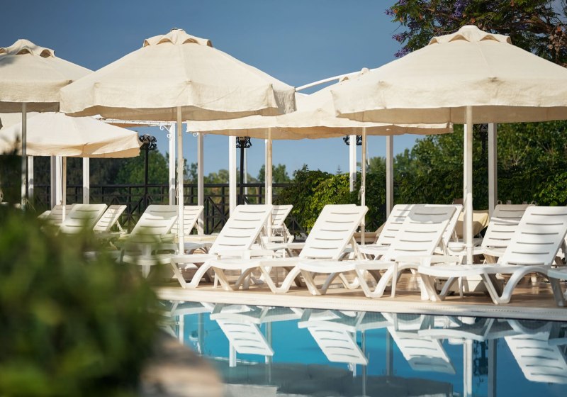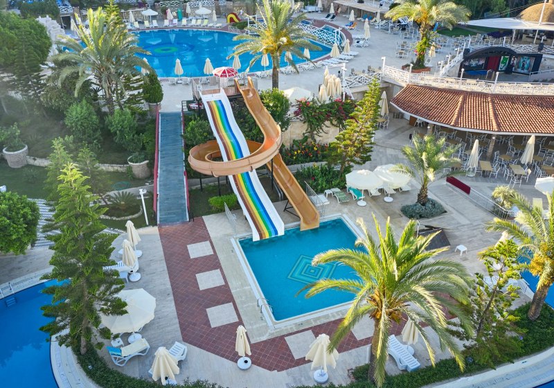 Im Seaden Corolla Hotel wohnt Ihr in einer weitläufigen Anlage an der Kumköy-Straße, mit kurzen Wegen zwischen Haupthaus, Nebengebäuden und den Pools. Zwei Süßwasserpools, separate Kinderbecken und ein Rutschenpool strukturieren den Tag, während das hoteleigene Strandstück nur wenige Schritte entfernt mit Liegen und Schirmen bereitsteht.