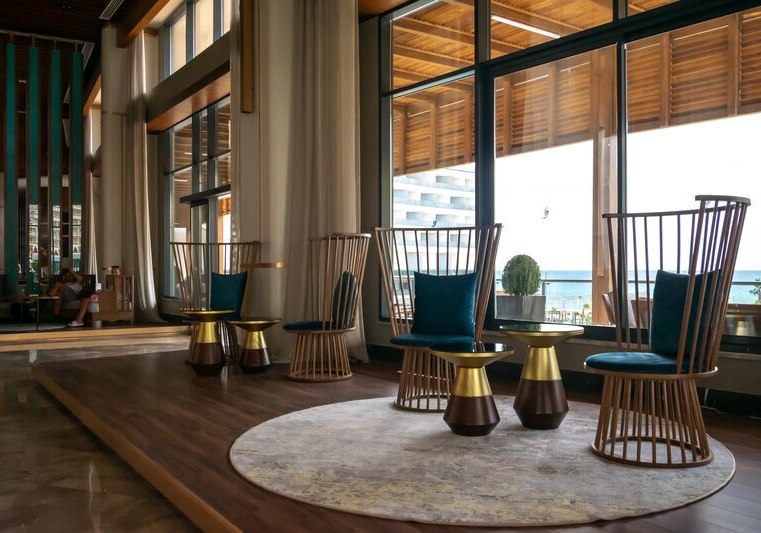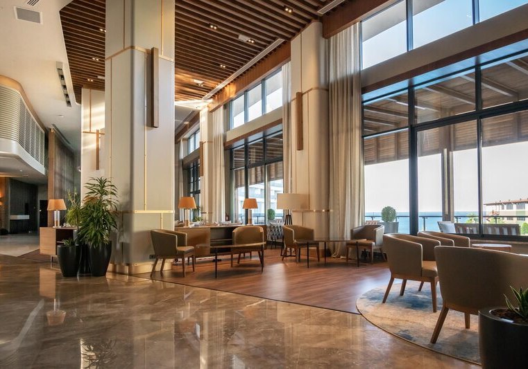 Das 2021 eröffnete Haupthaus mit neun Etagen bündelt Lobby, Rezeption und Loungeflächen mit WLAN im gesamten Bereich. Draußen verbinden Garten und Sonnenterrassen den großen Süßwasserpool mit separatem Kinderbecken; am Strand wie am Pool warten Liegen, Schirme und Badetücher.