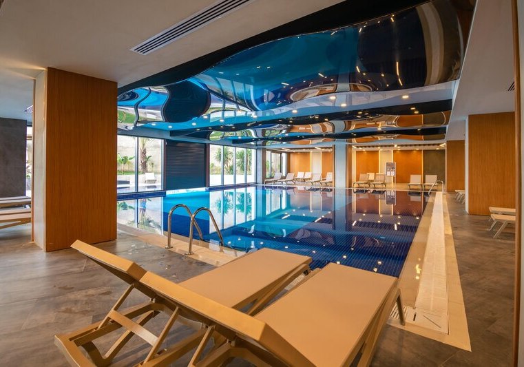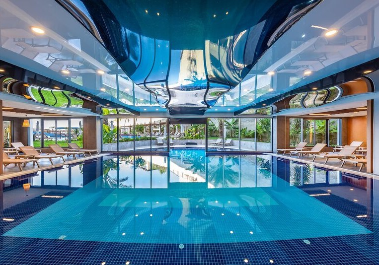 • Liegestühle • Hallenbad • Außenpool • Sonnenschirme • Poolbar • Badetücher • Pool