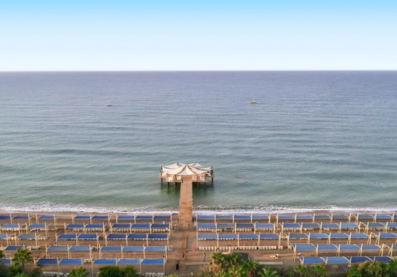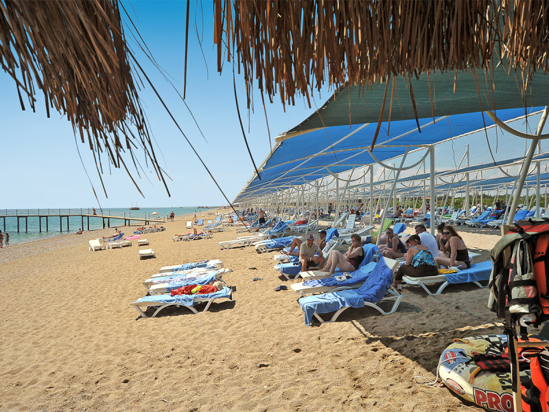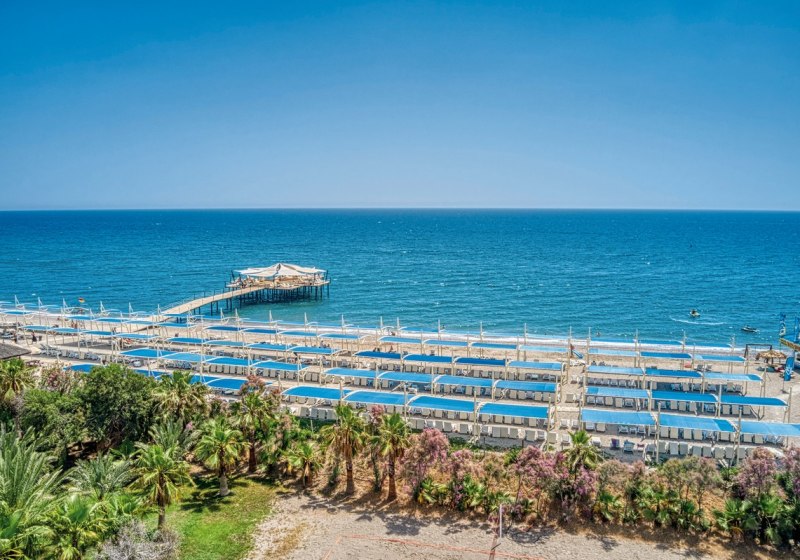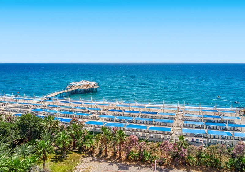 Ihr wohnt in Kizilagac direkt am breiten Sand-/Kiesstrand mit eigener Pier. Das Meer ist über kurze Wege erreichbar; an Strand und Pool nutzt Ihr Liegen, Sonnenschirme und Badetücher inklusive. Der Strand trägt die Blaue Flagge. Eine Strandbar und Umkleidekabinen unterstreichen die komfortable Nutzung am Wasser. Eine Bushaltestelle liegt etwa 10 Meter entfernt, öffentliche Minibusverbindungen sind verfügbar.