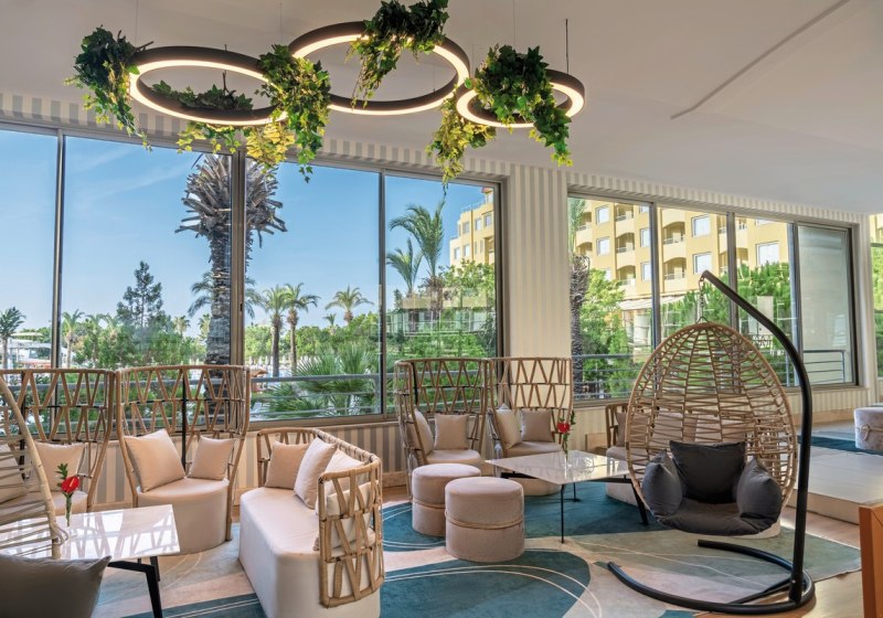 Die Anlage ist großflächig angelegt: Empfangsbereich mit 24‑Stunden‑Rezeption, Lobbybar und kostenlose WLAN-Abdeckung sorgen für Orientierung und kurze Wege. Zwischen Gartenflächen und Sonnenterrassen liegen neun Außenpools, Kinderbecken und der Aquapark mit Rutschen. Am Strand nutzt Ihr Liegen und Schirme, Handtücher erhaltet Ihr vor Ort.