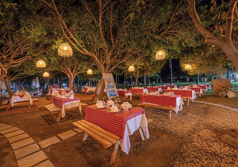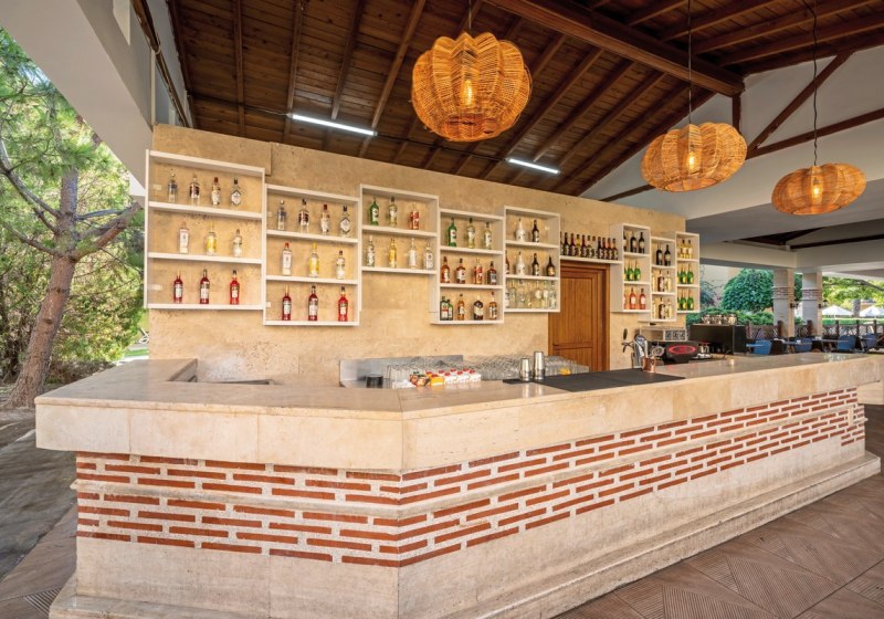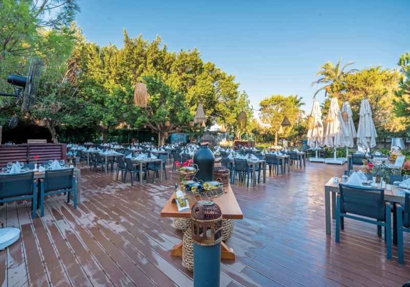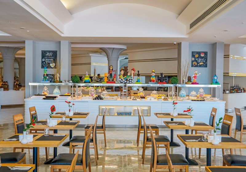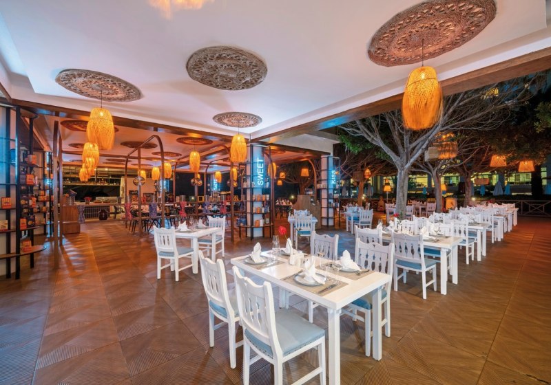 Im Hauptrestaurant wählt Ihr zwischen vielfältigen Buffets mit Live-Kochen, ergänzt von À-la-carte-Optionen. Für kurze Pausen warten Patisserie, Snack-Stand und Pool- beziehungsweise Snackbar. Das türkische Café bringt regionale Noten ins Spiel, Bars versorgen Euch mit alkoholfreien und alkoholischen Getränken.