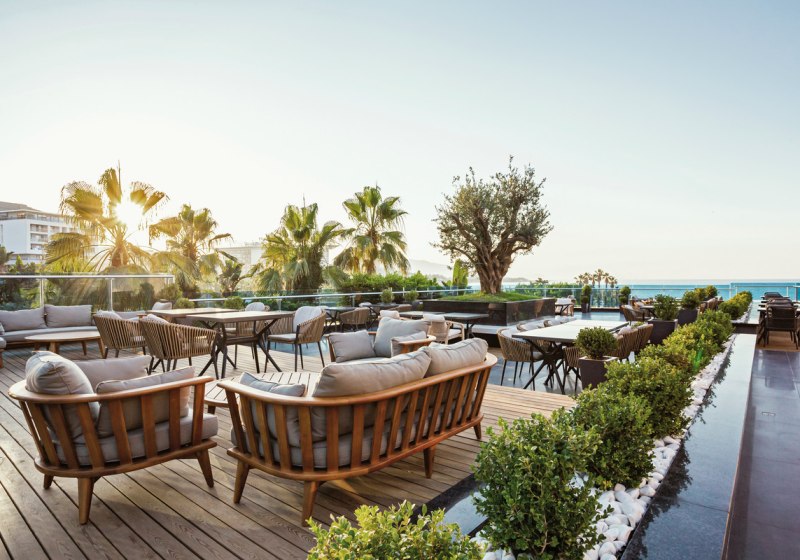 Der Spa-Bereich bündelt Hamam, Sauna, Massagen und Schönheitssalon. Der Zugang zum Terrassenpool mit Meerblick erfolgt über den Spa-Bereich und setzt ruhige Momente zwischen Anwendungen. Highlight: Klare Wegeführung vom Treatment direkt zum Meerblick-Pool.