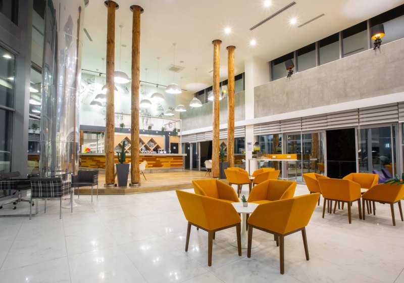 Die Gemeinschaftszonen sind bewusst gestaltet: Lobby mit WLAN, Sonnenterrassen am Süßwasserpool, Liegen, Schirme und Badetücher an Pool und Strand. Das Fitnesscenter ergänzt die entspannte Strandkulisse. Abends verlagert sich das Leben an Bars und Bühne. Highlight: Rooftop-/Terrassenpool mit Meerblick, Zugang über den Spa-Bereich.