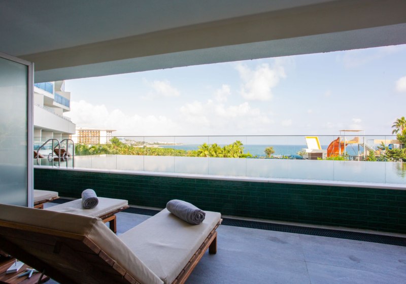 Ihr wohnt in Zimmern mit Dusche/WC, Föhn, individuell regulierbarer Klimaanlage, Wasserkocher, Minibar, LCD/LED-TV, Safe, Laminatboden und Balkon. Land- oder Meerblick sind buchbar. Highlight: Doppelzimmer mit direktem Poolzugang und Terrasse verbinden Privatsphäre und kurze Distanzen.