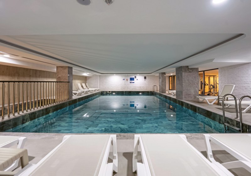 • Hallenbad • Außenpool • Poolbar • Wasserrutsche • Liegestühle • Pool