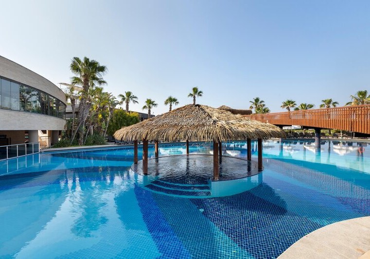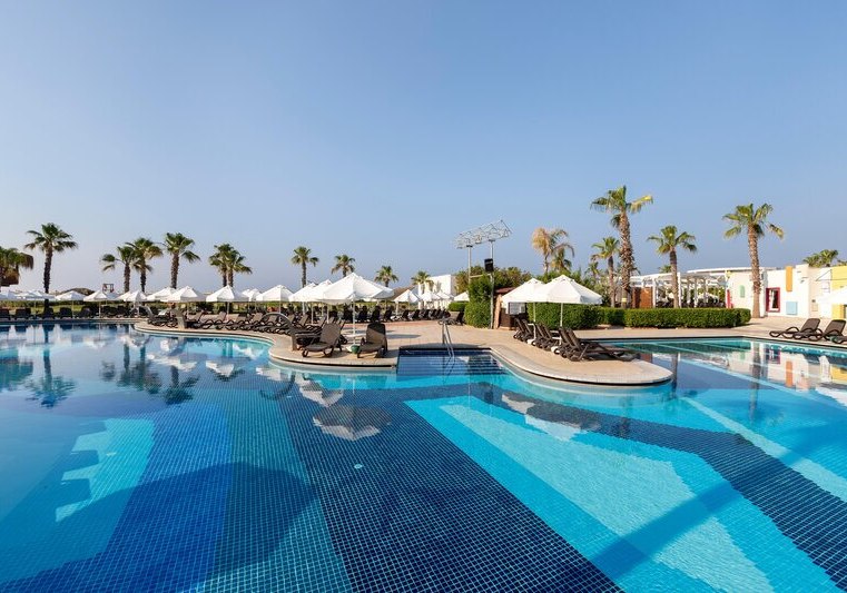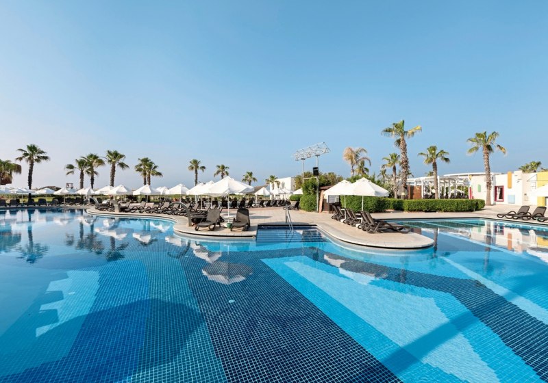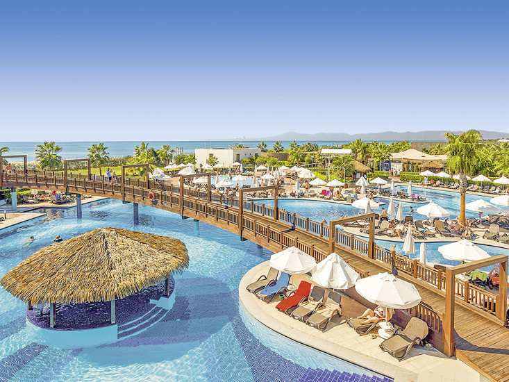 Das Resort ist klar gegliedert: großzügige Poollandschaft mit zwei Außenpools, sieben Wasserrutschen und weitläufiger Sonnenterrasse, dazu Gartenflächen und kurze Wege zum Strand. Liegen, Schirme und Badetücher sind am Pool wie am Strand inklusive. Im Inneren treffen Lobbybar, Shops, Café und Friseur auf praktische Services wie Mietwagenverleih und Parkplatz.