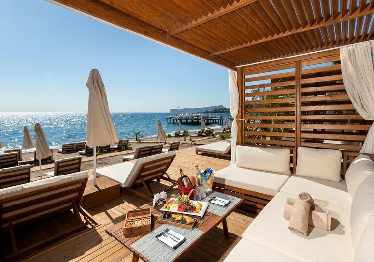 Liegen, Sonnenschirme und Badetücher stehen an Pool und Strand bereit. Ein öffentlicher Badesteg und ein VIP-Badesteg strukturieren den Zugang zum Meer. Pool- und Snackbars verteilen sich sinnvoll auf dem Gelände. Die große Poollandschaft mit drei Hauptpools, Aquapark und Kinderpools bildet das Herzstück der Außenbereiche. Highlight: Smarte Wegeführung, kurze Distanzen zwischen Zimmern, Pools, Strand.