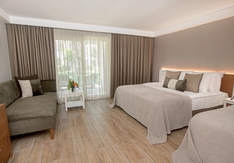Die Zimmer sind mit Dusche/WC, Föhn, Kosmetikspiegel, Direktwahl-Telefon, WLAN und zentral gesteuerter Klimaanlage ausgestattet. Minibar, Safe sowie ein Kaffee-/Tee-Setup gehören ebenso dazu. Ein LCD-Sat-TV mit Musikkanal und Laminatboden runden den Wohnkomfort ab. Auf dem Balkon atmet Ihr frische Luft und blickt je nach Lage in Garten, Poolbereiche oder aufs Meer.