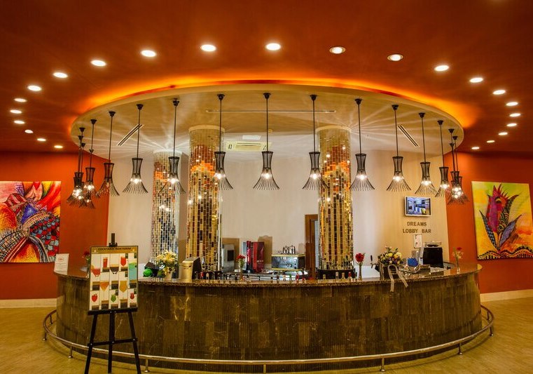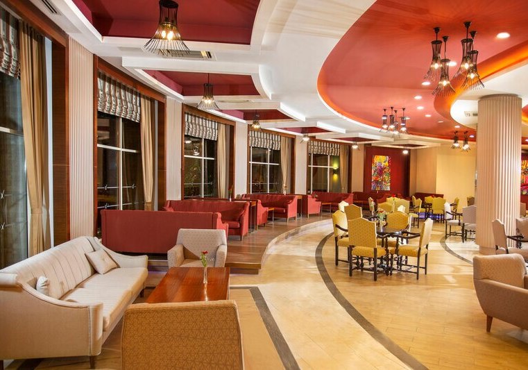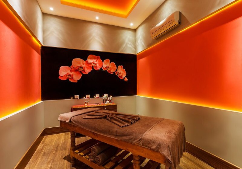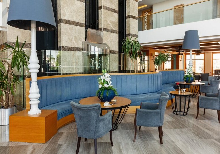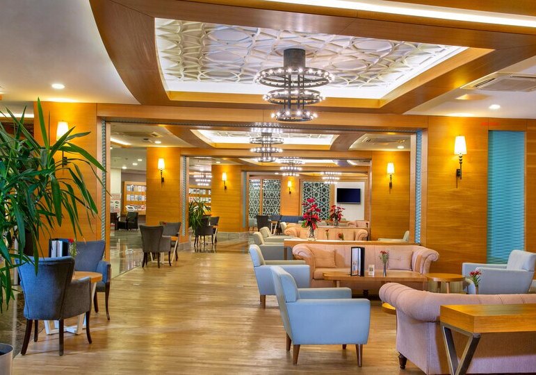 Die Anlage wirkt übersichtlich organisiert: Empfangshalle mit Rezeption und Lobbybar, Internetecke sowie Konferenzräume bilden die funktionale Basis. WLAN ist in öffentlichen Bereichen und Zimmern inklusive. Friseur, Geschäfte, Gartenanlage und ein Supermarkt runden das praktische Angebot klar ab.
