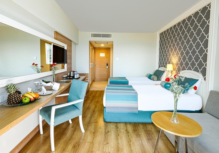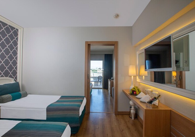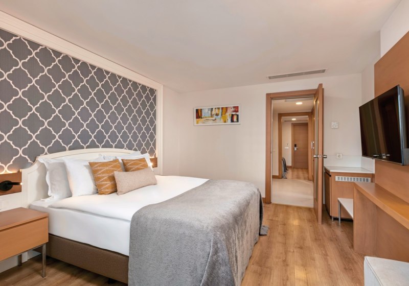 Zur Ausstattung zählen Dusche, WC, Föhn, Telefon, Minibar, Sat-TV, Safe und WLAN. Zusatzdetails wie Kinderbett, Hausschuhe oder Kaffee-/Teezubereiter sind verfügbar. Wer separaten Schlafraum schätzt, greift zur Juniorsuite oder Familiensuite – für ruhige Abende nach Pool, Strand und Showprogramm.