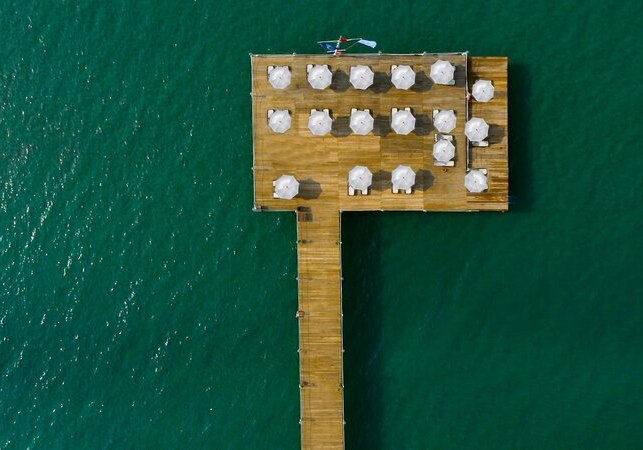 - Komfort am Meer: Badesteg sowie Liegen, Schirme und Tücher an Strand und Pool.
