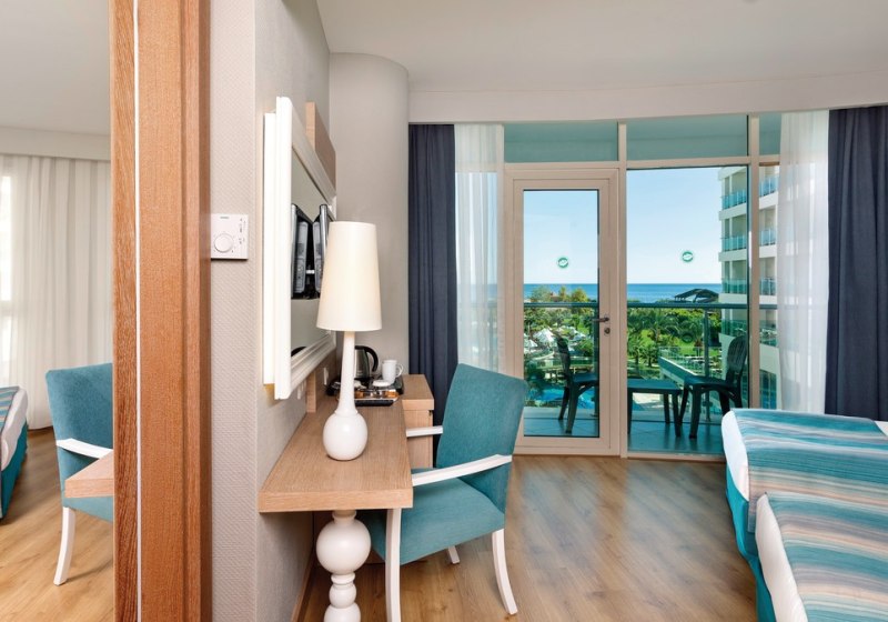 Ihr wählt zwischen Doppelzimmern, Familienzimmern mit Verbindungstür, Juniorsuiten mit separatem Schlafzimmer und Familiensuiten mit circa 45 Quadratmetern. Buchbar sind seitlicher oder direkter Meerblick. Laminatboden, Balkon und Klimaanlage geben einen klaren, aufgeräumten Rahmen.