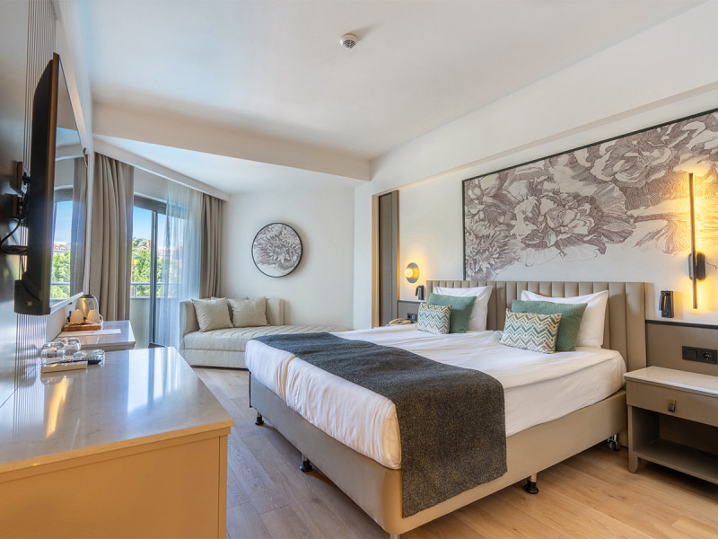 Ihr wohnt etwa 600 Meter vom feinsandigen, flach abfallenden Strand entfernt. Der Weg ist kurz, ein Shuttleservice ist nicht vorgesehen. Bis Side sind es rund acht Kilometer – nah genug für Ausflüge, weit genug für Ruhe im Hotelalltag. Strandliegen und Schirme stehen inklusive bereit.