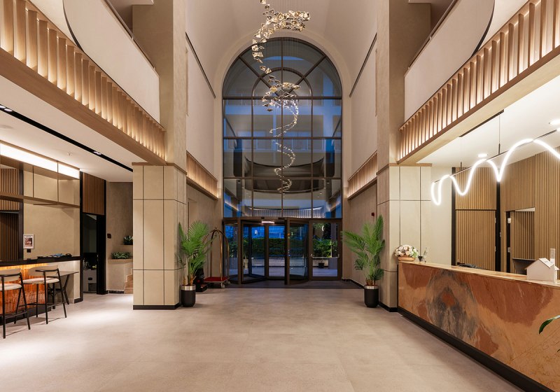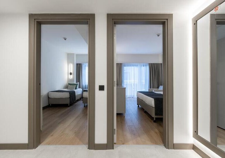 Ihr wählt zwischen Doppel- und Superior-Zimmern, großen Doppelzimmern mit Schlafsofa oder Familienzimmern mit zwei Schlafzimmern und Verbindungstür. Die meisten Einheiten verfügen über Balkon, die barrierefreien Zimmer sind ohne Balkon konzipiert. Laminatboden und eine klare Linienführung prägen das Wohngefühl.