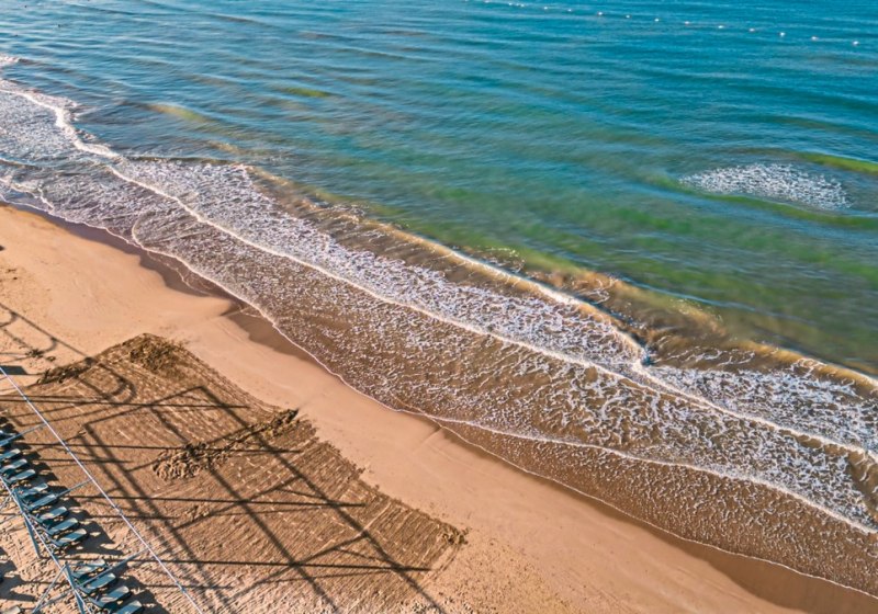 Strand• Strand (ca. 400m entfernt, sandig, getrennt durch Straße) • Liegestühle • Sonnenschirme • Strandbar