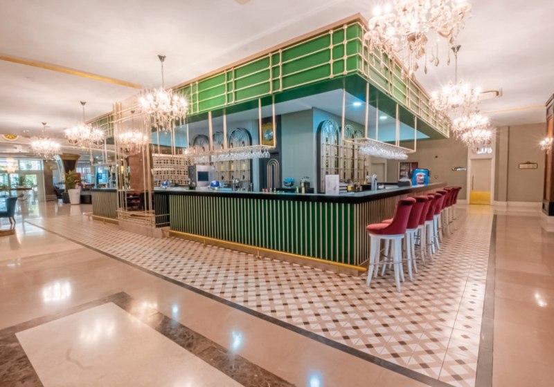Die öffentlichen Bereiche sind klar gegliedert: Empfangshalle mit Rezeption und Sitzecken, Lifts und kostenfreies Wi‑Fi im gesamten Hotel. Geschäfte, Supermarkt, Souvenir‑Shop und Friseur decken Alltagsbedürfnisse ab. Dazu kommen Sonnenterrassen, Außenmöbel und Gartenflächen als ruhige Gegenpole zum Programm.