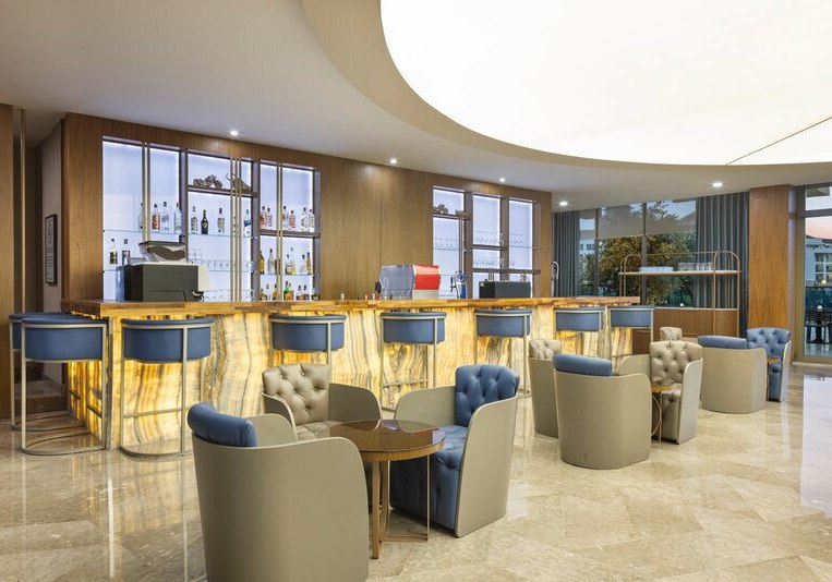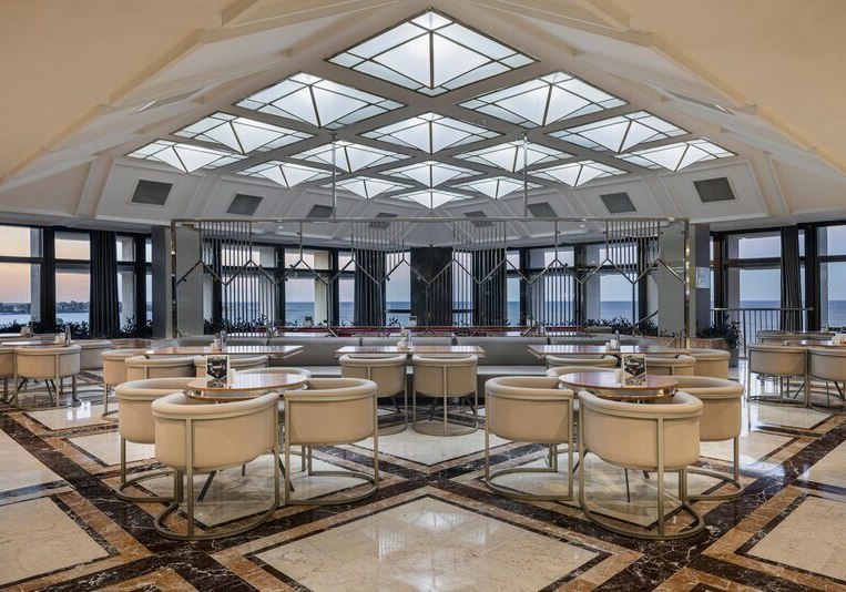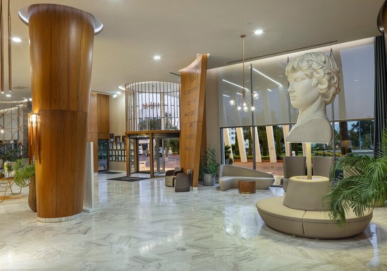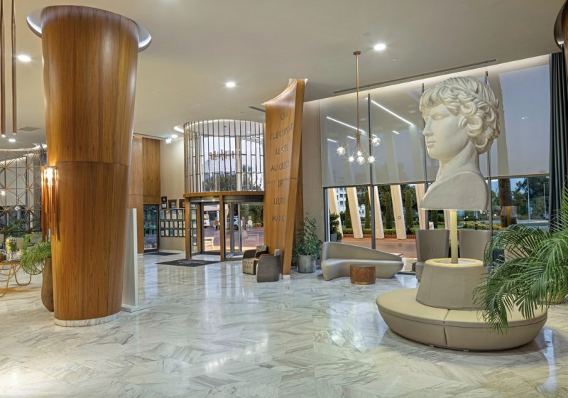 Die öffentlichen Bereiche sind klar strukturiert: Lobby und Rezeption gehen in Wege zu Pools, Terrasse und Strand über. Lifts verbinden Haupt- und Nebengebäude, Konferenzräume und exklusive Geschäfte ergänzen die Infrastruktur. WLAN ist in der gesamten Anlage verfügbar, dazu Internetcafé und Friseur. An Pool und Strand nutzt Ihr Liegen, Sonnenschirme und Badetücher ohne Umwege, die Sonnenterrasse bündelt Blick und Ruhe.