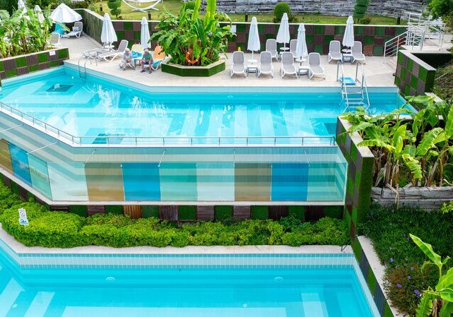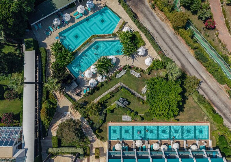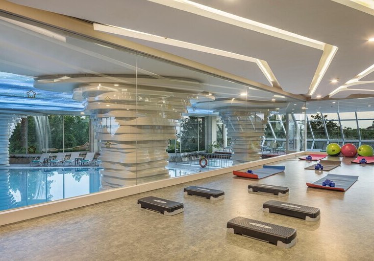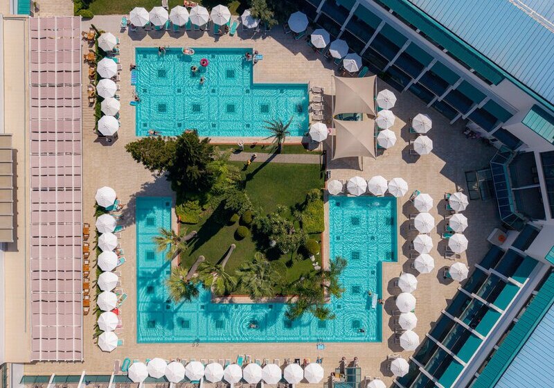 Im Spa-Bereich erwarten Euch ein traditionelles türkisches Bad (Hamam), Sauna und ein saisonal verfügbares Dampfbad. Ein Steinsalz-Raum ergänzt das Angebot, dazu kommt ein Hallenbad für wetterunabhängige Bahnen. Draußen verteilt sich das Geschehen auf mehrere Süßwasserpools, darunter ein separater Kinderbereich und zwei Wasserrutschen.