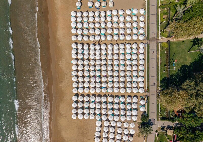 Oberhalb der Hotelzone von Side liegt Side Star Elegance direkt an der Kumköy-Straße und öffnet sich zum langen, flach abfallenden Sandstrand mit Promenade. Ihr wechselt in Minuten zwischen Poolbereich und Meer, ohne Umwege. Die historische Altstadt von Side erreicht Ihr nach rund drei Kilometern – ideal für einen Ausflug zwischen Ruinen, Hafenflair und Fotomotiven zum Sonnenuntergang.