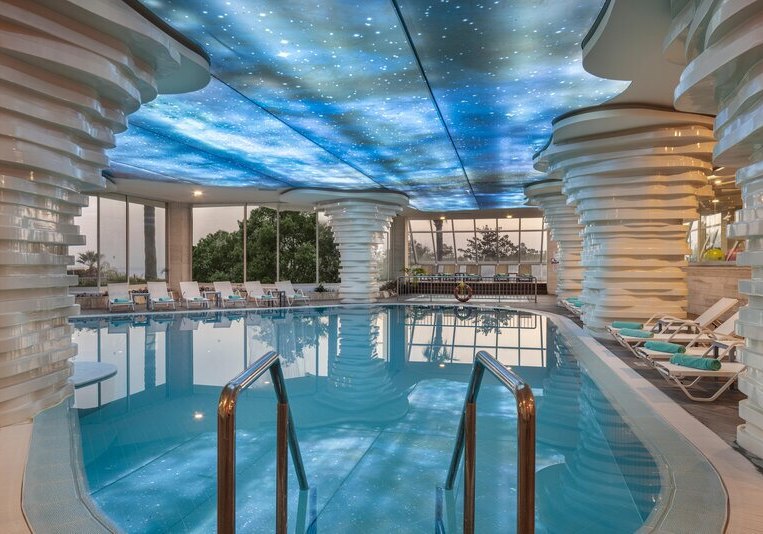 • Liegestühle • Hallenbad • Außenpool • Sonnenschirme • Poolbar • Badetücher • Wasserrutsche • Pool