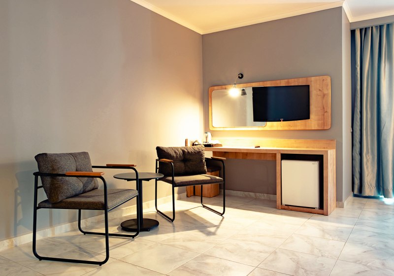 Alle Wohneinheiten verfügen über einen Balkon, für zusätzliche Perspektive bucht Ihr seitlichen Meerblick. So wechselt Ihr zwischen Ruhe im Zimmer und Blick in die Weite. Klare Linien und praktische Details prägen das Ambiente, ideal für erholsame Nächte nach Strand, Pool und Programm.