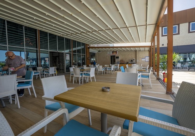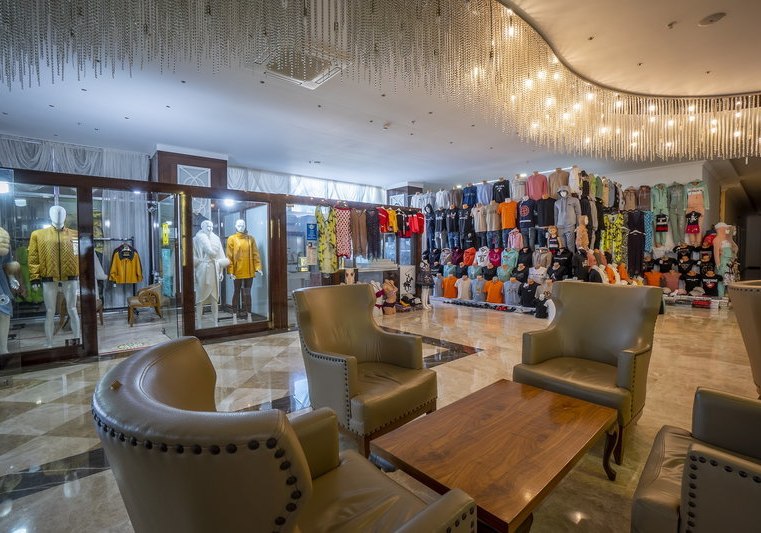 Die Anlage ist weitläufig gedacht: Außenpool mit Rutschen, Kinderbecken und Sonnenterrasse treffen auf Hallenbad und Garten. Liegestühle und Schirme sind vorgesehen. Drinnen findet Ihr Lobby, TV-Raum, Spielzimmer und Shops bis zum Supermarkt. Für geschäftliche Anlässe stehen Konferenzraum, Bankettsaal und Business-Center bereit.