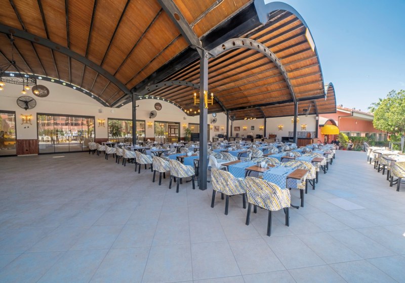 Im Buffetrestaurant mit Terrasse esst Ihr vielfältig und unkompliziert. All Inclusive deckt Frühstück, Mittag- und Abendessen ab, ergänzt durch Snacks und Getränke – alkoholisch wie alkoholfrei. Live-Kochen bringt Frische an die Stationen, vegetarische Varianten und Kindermenüs runden das Angebot stimmig ab.
