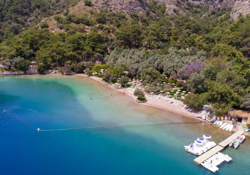 Die Lage spricht für sich: In Ölüdeniz wohnt Ihr etwa 150 Meter vom Strand entfernt, mit Fethiye in rund 12 Kilometern Entfernung. Einkaufsmöglichkeiten, Restaurants und Unterhaltung liegen in fußläufiger Nähe, öffentliche Minibusse und Taxis erleichtern spontane Ausflüge. So bleibt Ihr flexibel zwischen Beachlife und Stadtbesuch.