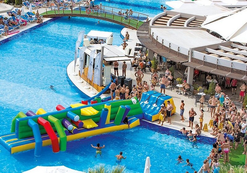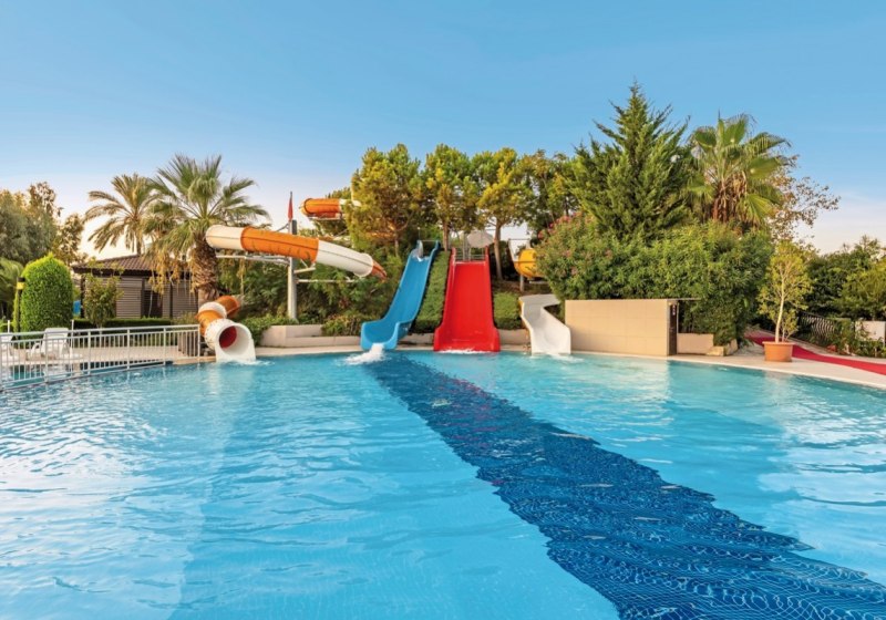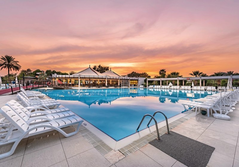 - Poollandschaft: Mehrere Becken inklusive Rutschen und Kinderbereich strukturieren den Tag.