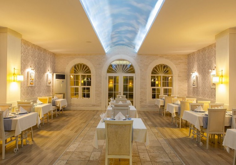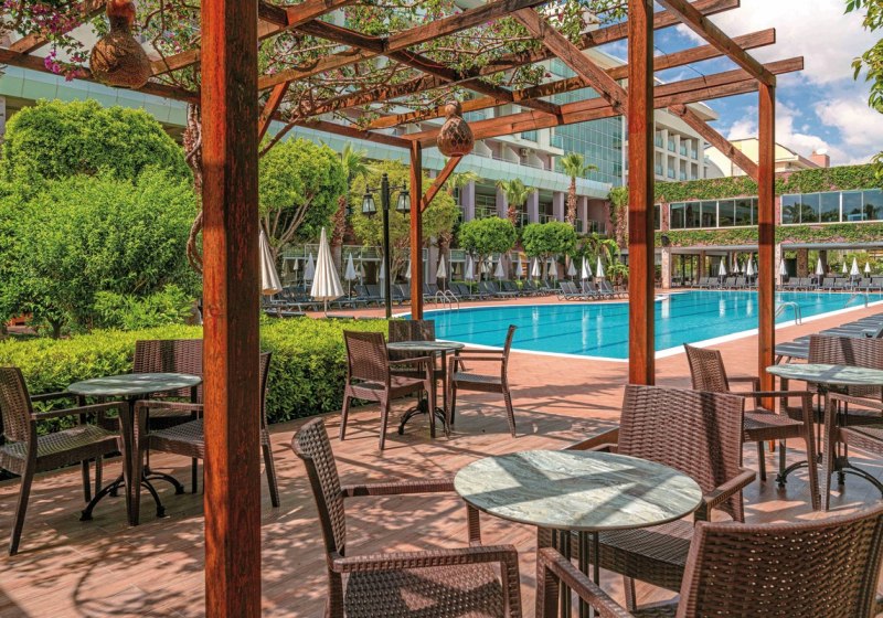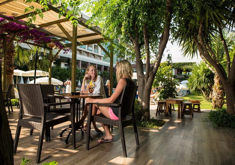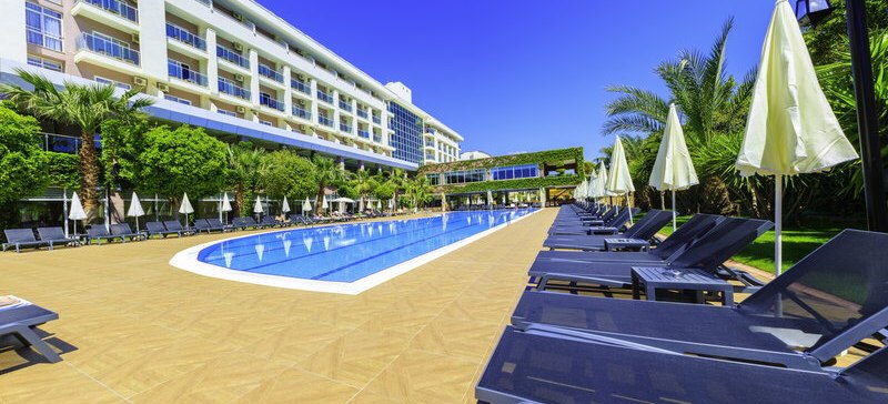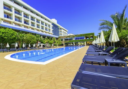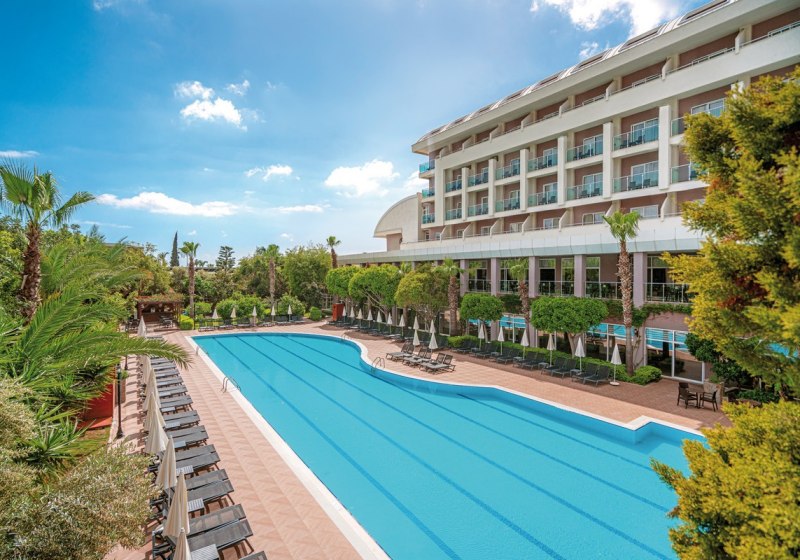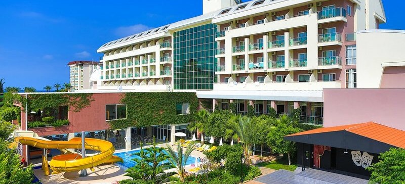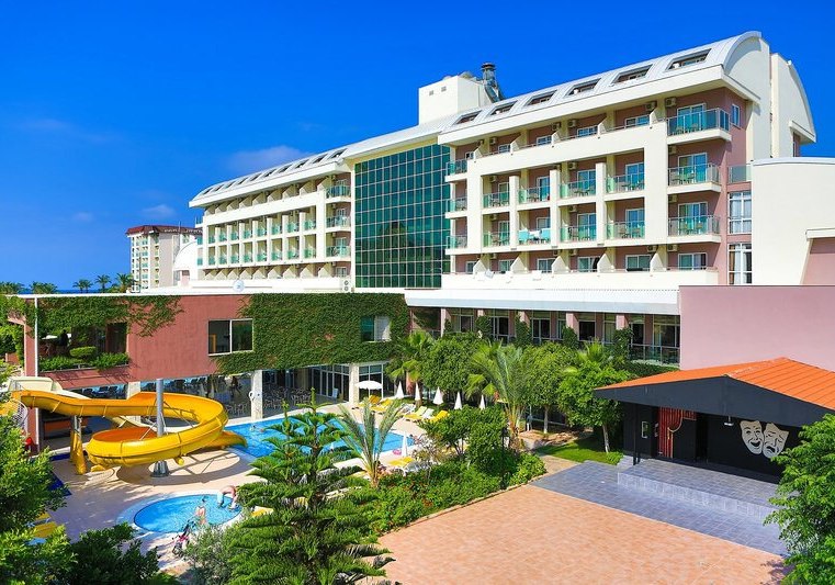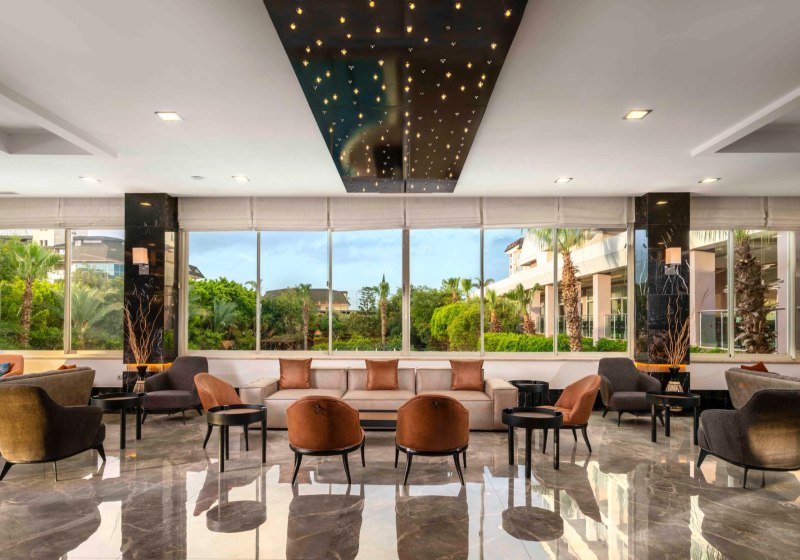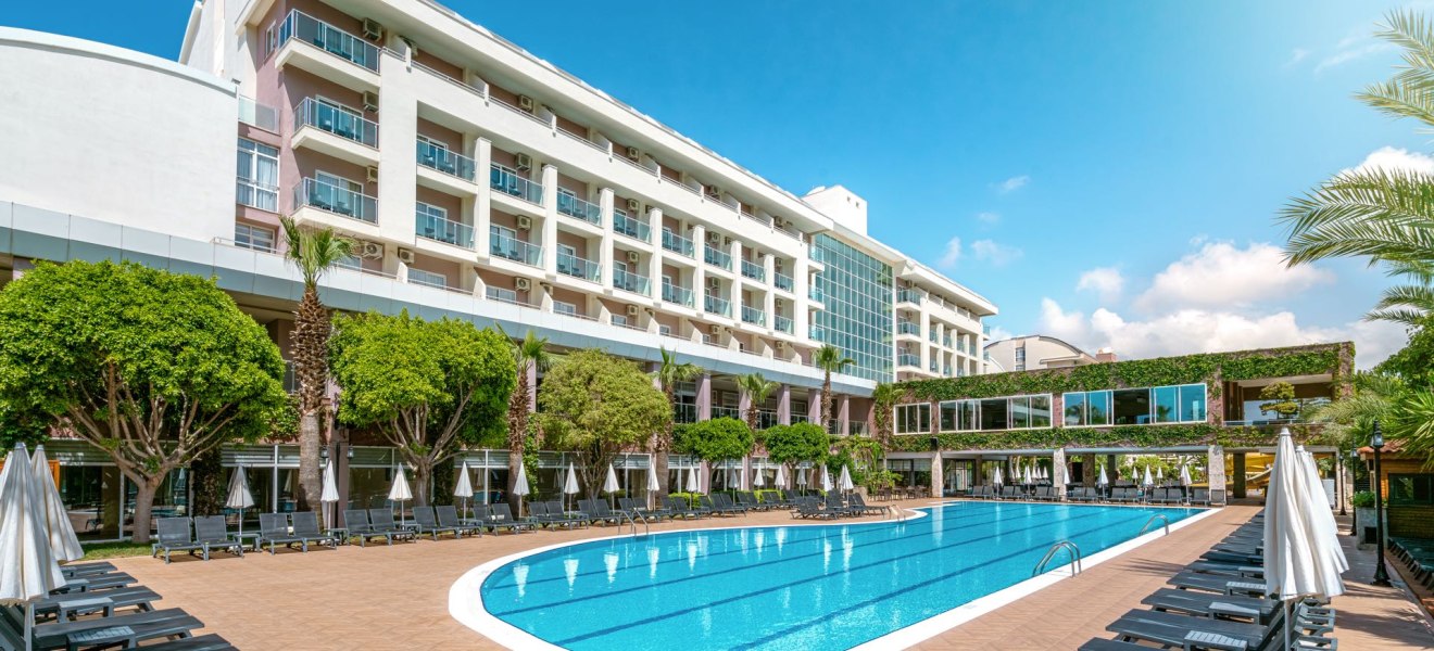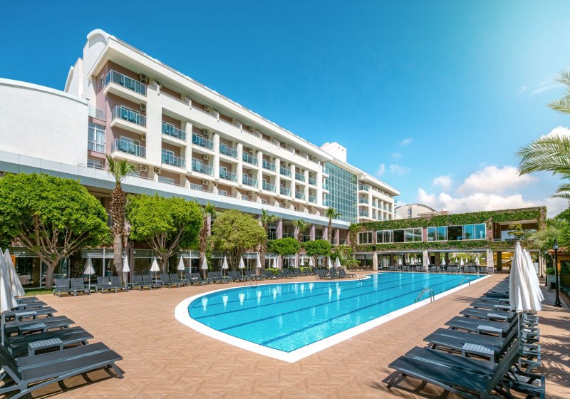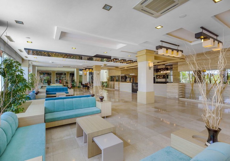 Im Telatiye Resort erwartet Euch ein lebhaftes Strandresort mit direktem Draht zum Mittelmeeralltag. Die Anlage gruppiert sich um Pools, Terrassen und einen eigenen Strandabschnitt aus Sand und Kies. Ihr bewegt Euch zwischen Lobby mit Sitzgruppen, Patisserie und Bars, während draußen Wasserrutschen, Sonnenterrasse und der Blick Richtung Küste die Kulisse setzen. Familien finden Platz und Struktur, Aktivreisende kurze Wege zu Sport und Programmen.