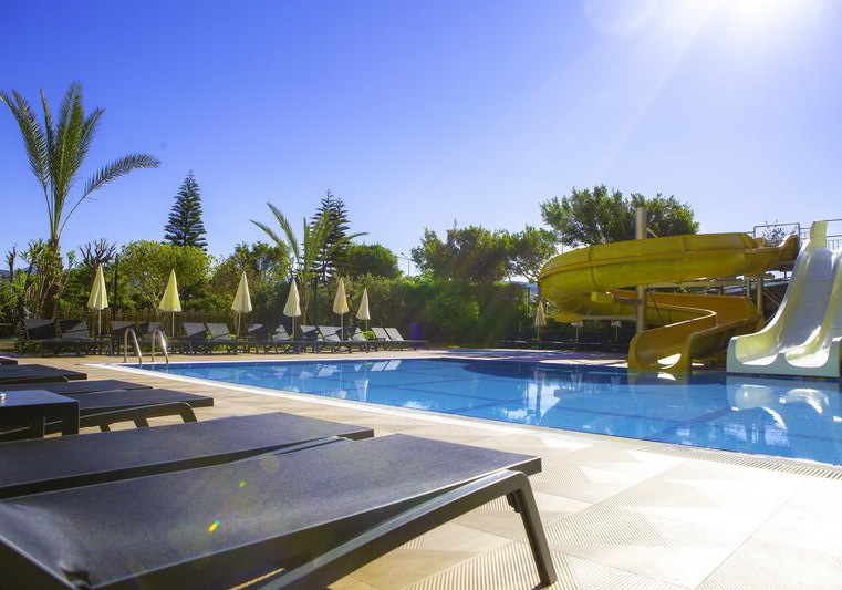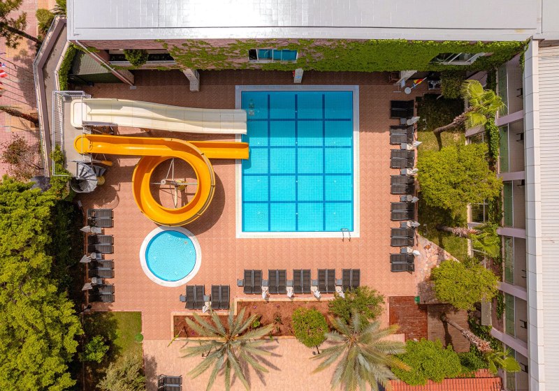- Rutschen‑Pool: Zwei Wasserrutschen plus separates Kinderbecken.